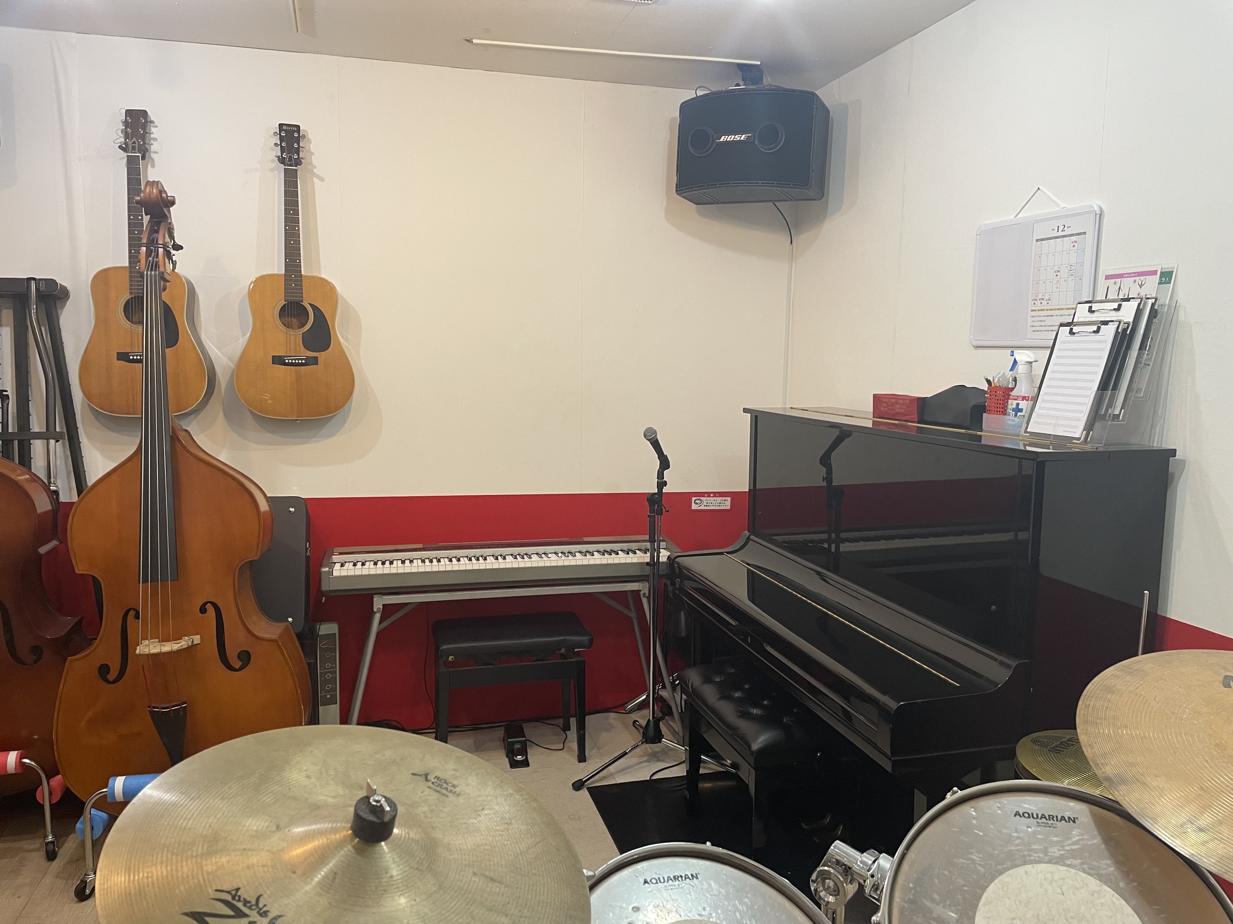 常設のアップライトピアノ・ドラムセット(3室中2室に完備)・アンプ類・PA装置は追加料金なしでご利用いただけます。